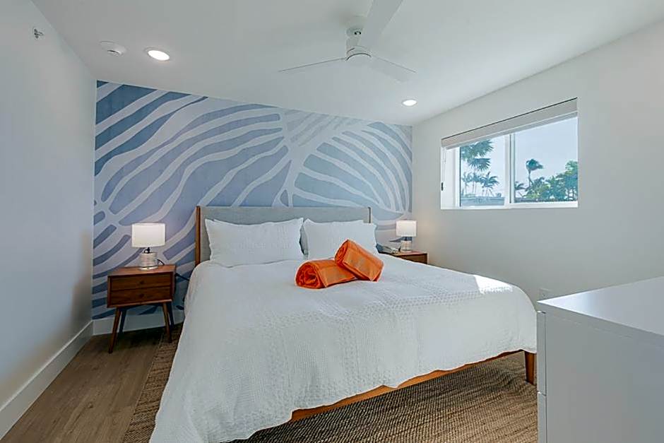 This 2-level suite includes an upstairs seating area and a hospitality bar area with a microwave, refrigerator and a large flat-screen TV. A king bed, full bathroom and a seating area are located downstairs, as is a balcony overlooking the courtyard.