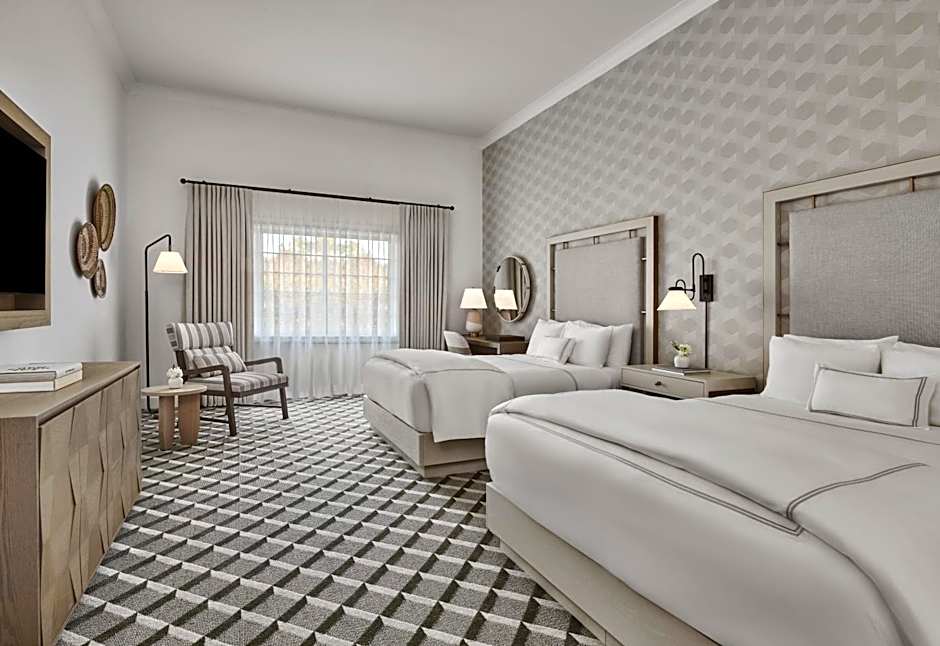 This 2-level suite includes an upstairs seating area and a hospitality bar area with a microwave, refrigerator and a large flat-screen TV. A king bed, full bathroom and a seating area are located downstairs, as is a balcony overlooking the courtyard.